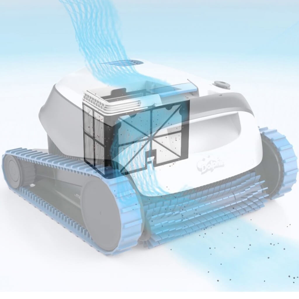 Специальные гусеницы обеспечивают максимальное сцепление с поверхностью дна и стен. Универсальная щетка бережно адаптируется к покрытию и позволяют быстро очищать дно чаши бассейна от скопившихся водорослей и от всевозможных механических примесей.